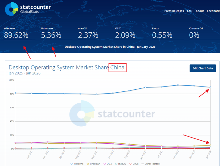 根据Statcounter的公开统计,2025年底到2026年初,中国PC操作系统市场中,Windows仍然占据85%到90%的份额。